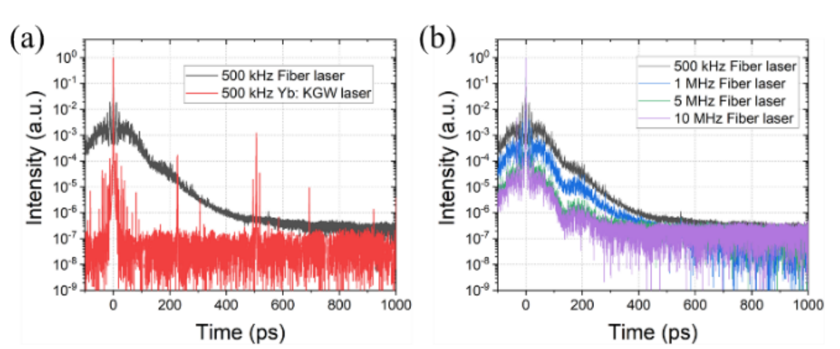 (a)两种激光器在 500 kHz 重复频率下的对比度比较。 (b)光纤激光器在不同重复频率下的对比度。