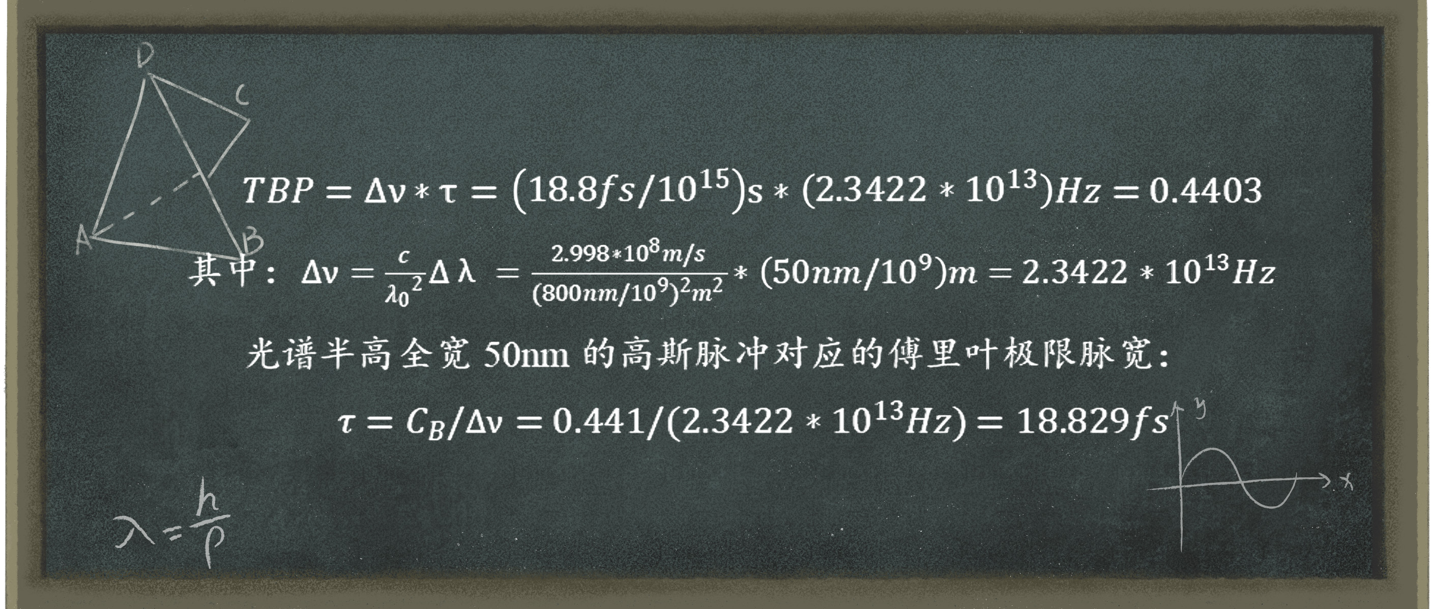 其中Δt是脉冲的时域半高全宽(通常以秒为单位),Δf是脉冲的频谱半高全宽(通常以赫兹为单位),λ0是中心波长,λΔ是光谱宽度。