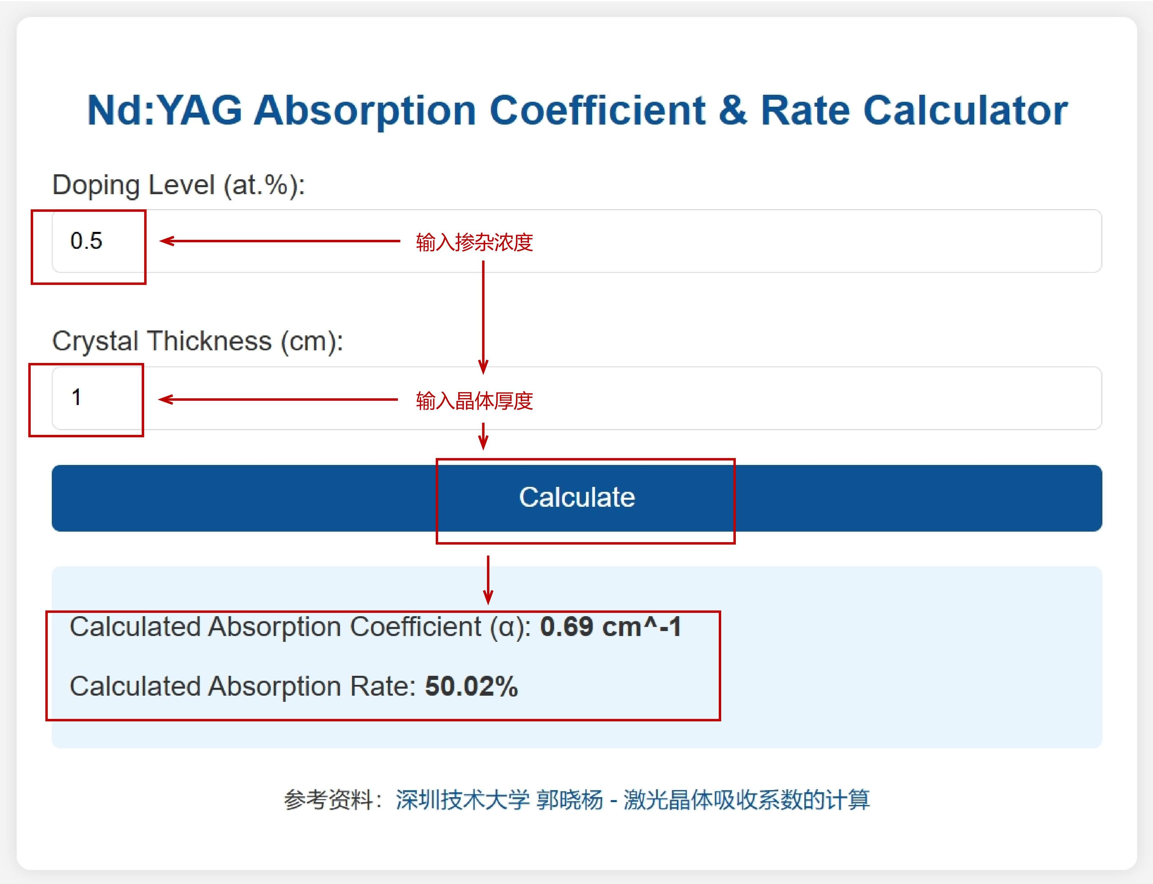 在现代激光技术与光学材料领域,Nd因其卓越的光学性能和热稳定性,广泛应用于高功率激光器、医疗设备及科研仪器中。准确计算Nd的吸收系数对于优化激光器性能、提升能量转换效率具有至关重要的意义。本文将解析Nd吸收系数计算器的网页源代码,介绍其基本概念、计算公式,并指导用户如何使用这一在线工具,以助科研人员和工程师高效完成相关计算。
