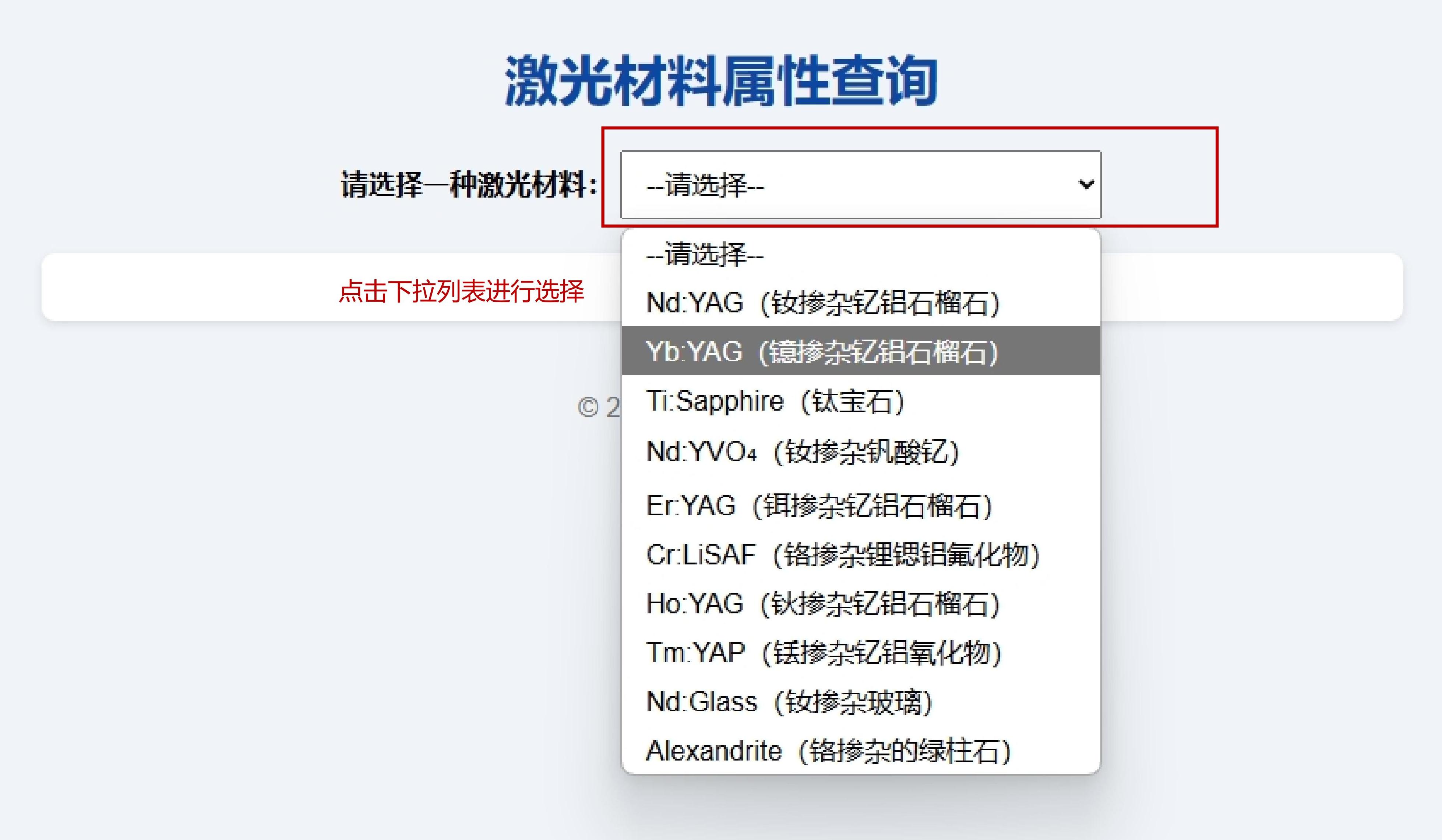 在下拉菜单中选择所需查询的激光材料。