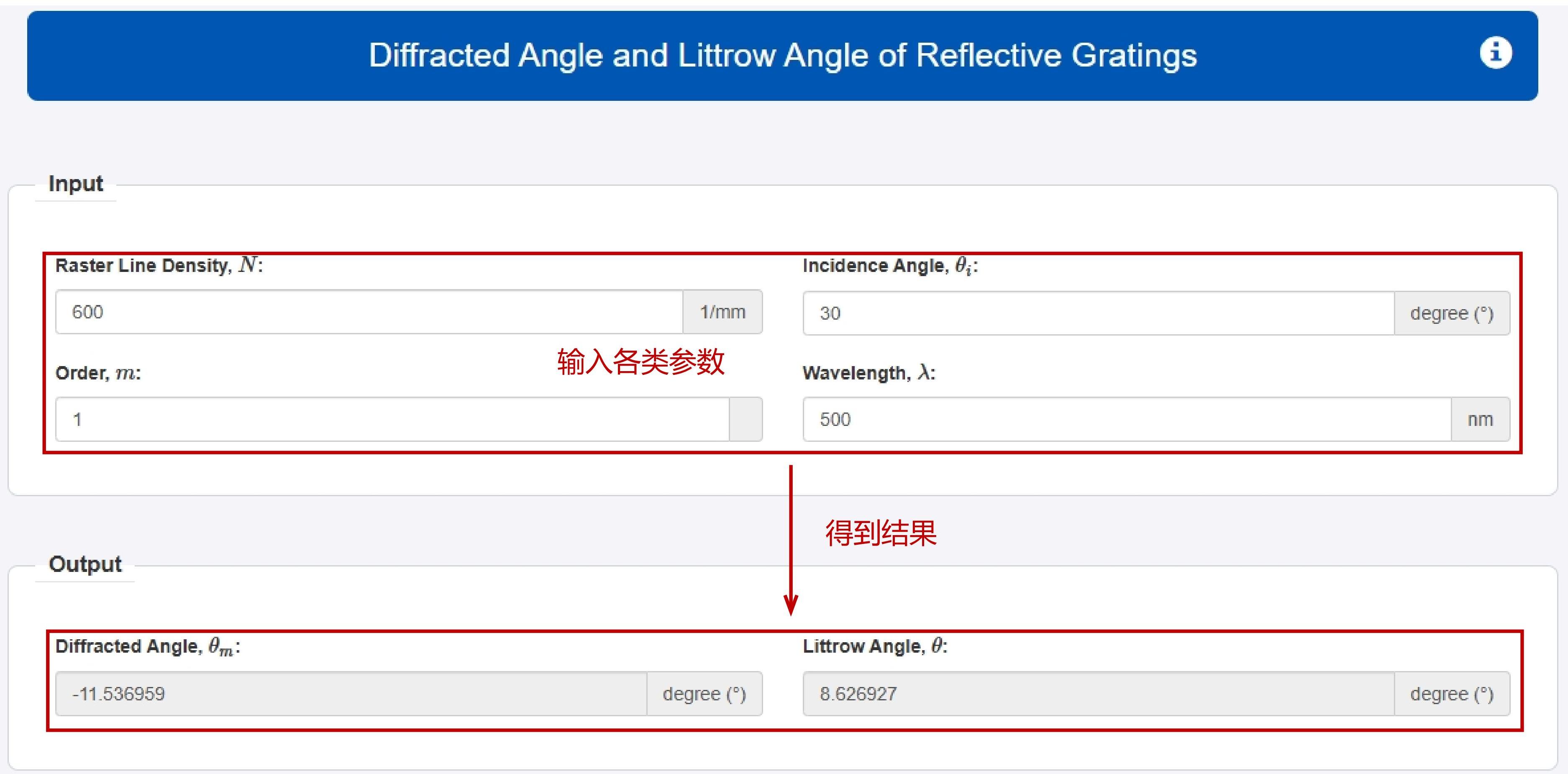 反射光栅的衍射角和利特罗角的计算基于以下公式:
