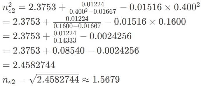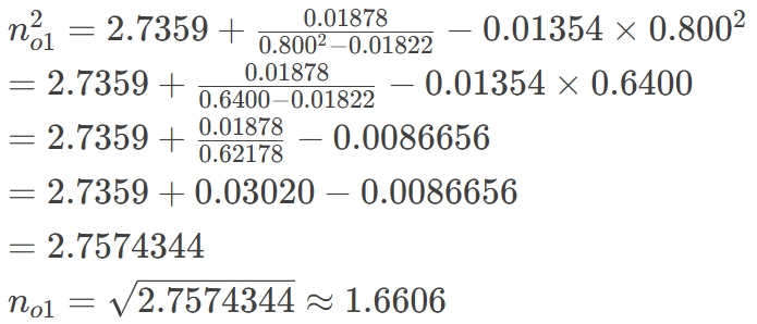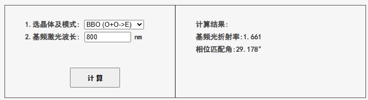 | 我们以800nm激光在BBO晶体中的I类相位匹配(O+O→E)为例,详细展示计算过程。 已知条件: