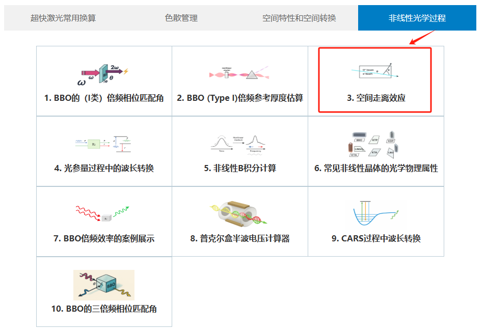 在非线性光学频率转换过程中,走离效应是影响转换效率的关键因素之一。走离角作为量化这一效应的重要参数,直接决定了基频光和倍频光在晶体中的空间分离程度。本文介绍的"激光倍频走离角计算器"是一款基于Web的工具,能够快速计算各种非线性晶体在不同波长下的走离角。通过解析该计算器的代码实现和物理原理,我们将系统性地介绍走离角的相关知识,包括其物理概念、计算公式、使用方法以及实际应用案例。
