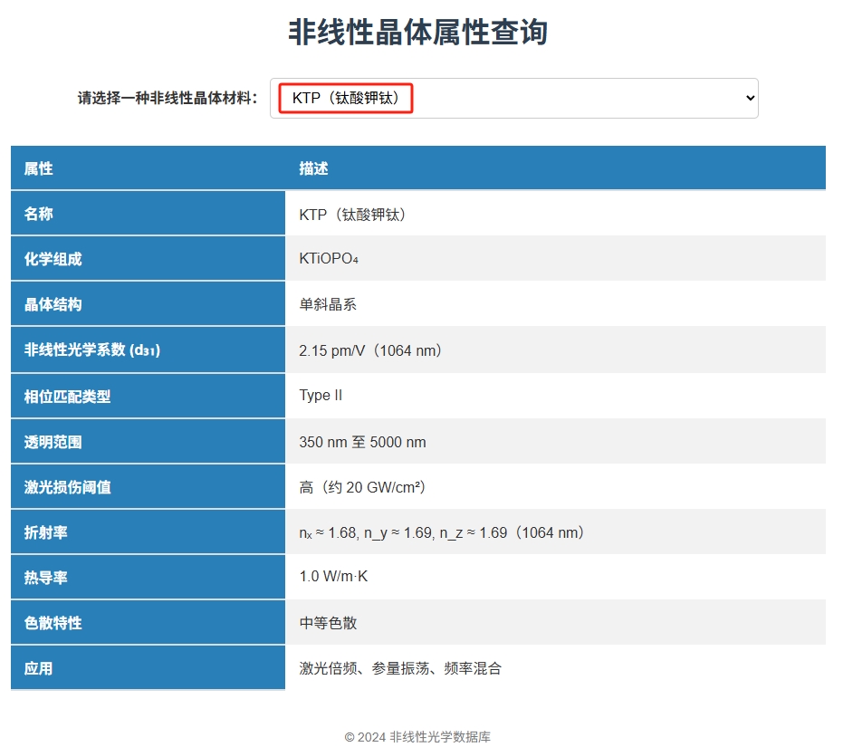 非线性光学晶体是现代激光技术不可或缺的核心材料。通过该网页工具,研究人员可以快速查阅常见晶体的关键物理与光学参数,为实验设计、器件选型提供基础数据支持。