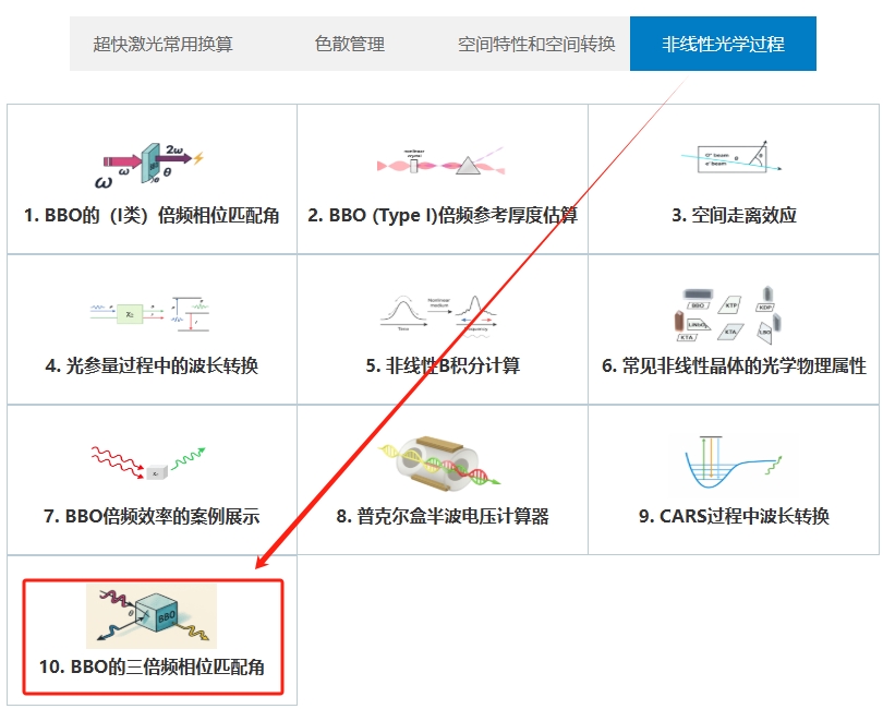 在超快激光领域,倍频技术能够将红外或可见光转换为更短波长的紫外光,从而拓展应用范围。BBO(β-硼酸钡)晶体因其宽透过带、高损伤阈值而被广泛用于二倍频、三倍频等非线性光学过程。要获得高效的三倍频输出,必须精确地切割晶体,使其满足相位匹配条件。